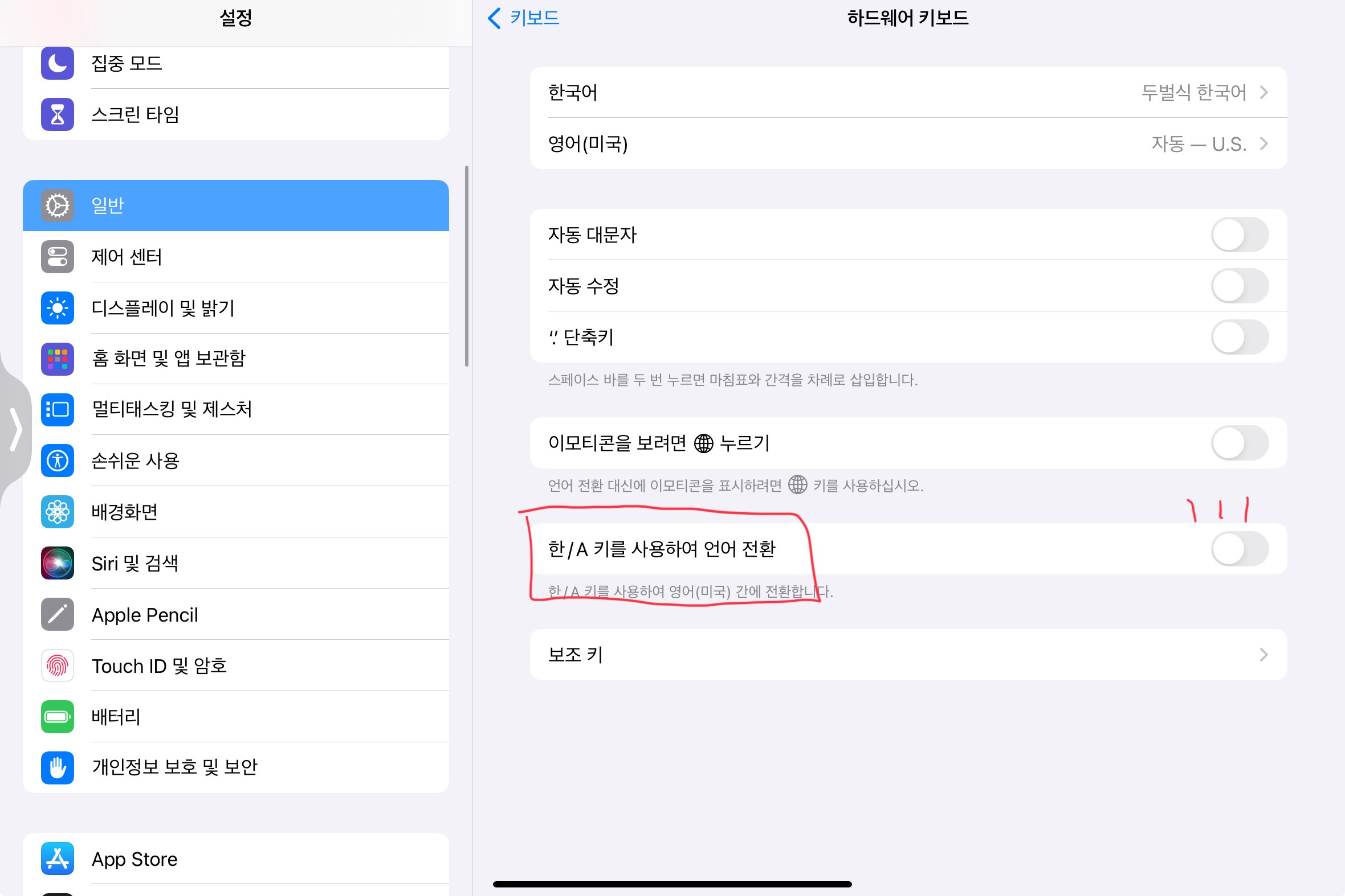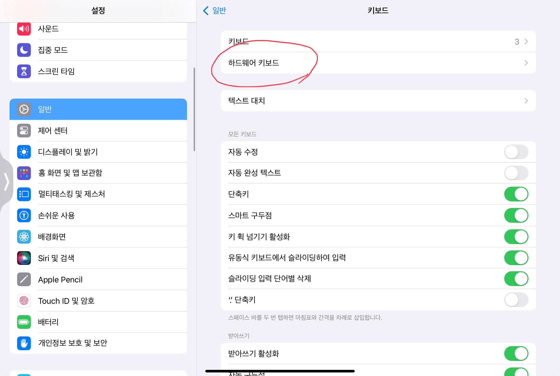 맥북과 아이패드를 연결하셨다면 키보드에 '하드웨어 키보드'가 활성화 되어 있습니다.