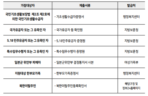 다음은 가산점을 받을 수 있는 신청자에게 필요한 서류입니다. 해당하시는 분들은 꼭 챙겨서 보내시길 바랍니다.