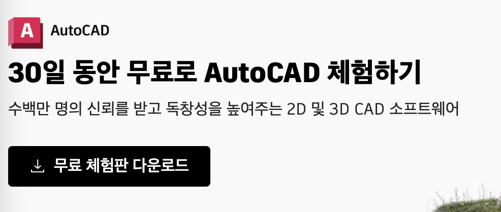 오토캐드를 타 사이트에서 불법 다운로드하면 저작권 등으로 문제가 생길 수 있기 때문에, 정품 라이센스가 있는 아래 홈페이지에서 무료로 다운받아서 사용하시길 바랍니다. 일반 직장인의 경우 체험판을 30일 동안 무료로 사용할 수 있습니다.