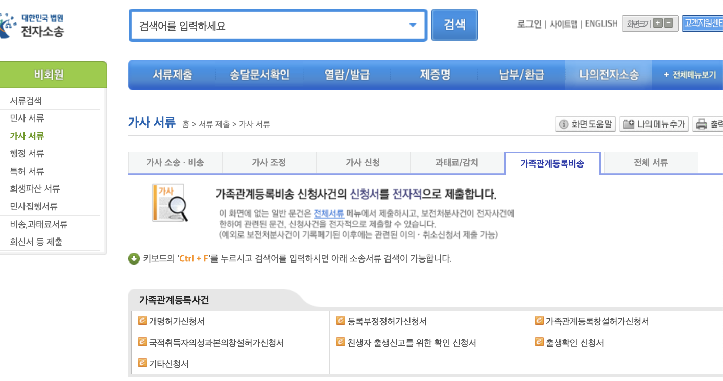 서류제출 > 가사서류 > 가족관계등록비송 > 개명허가신청서 순서대로 클릭해주세요.