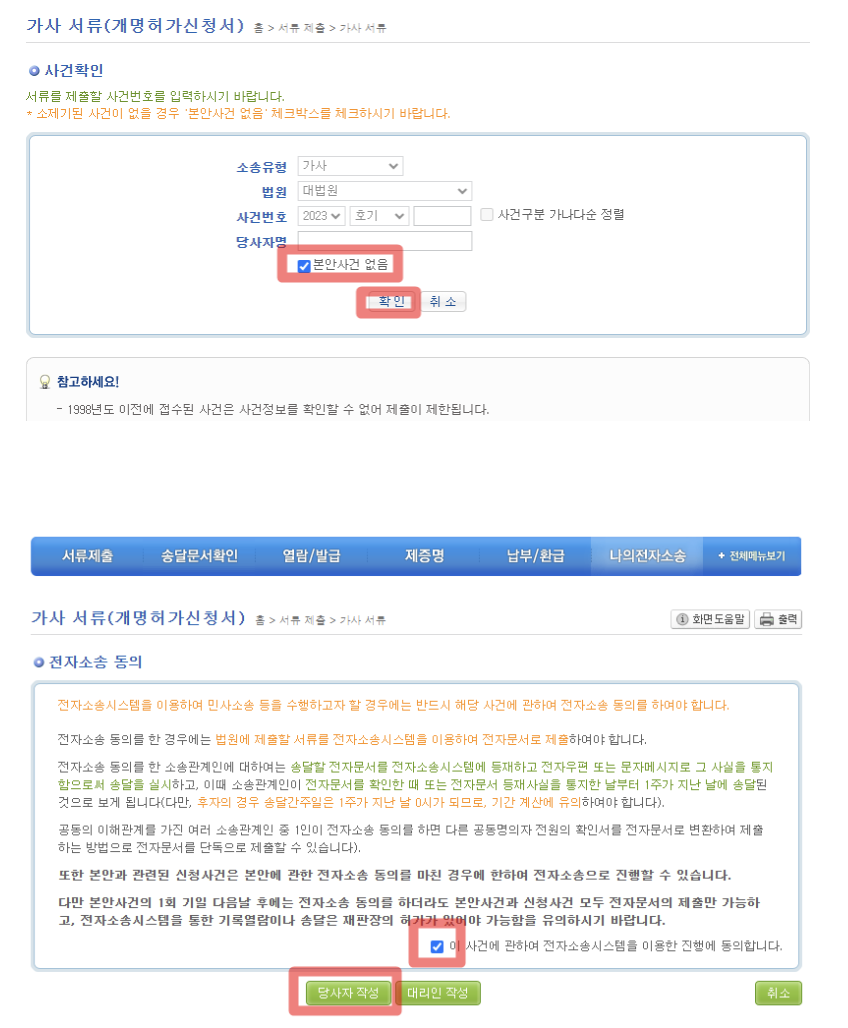 가가 서류(개명허가신청서) > 본인사건 없음 클릭