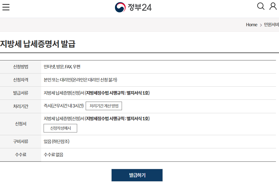 지방세완납증명서 발급은 정부24 홈페이지에서 무료로 발급이 가능합니다.