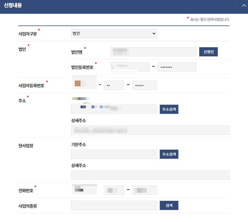 로그인을 하면 개인/법인 신청인 정보를 입력하는 창이 나옵니다.