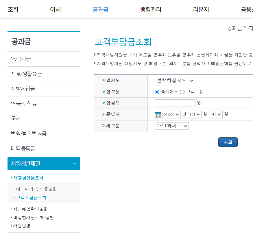 농협은행 홈페이지에 접속해줍니다. 공과급 > 지역개발채권 > 미상환채권조회, 상환 탭에서 조회하면 됩니다.