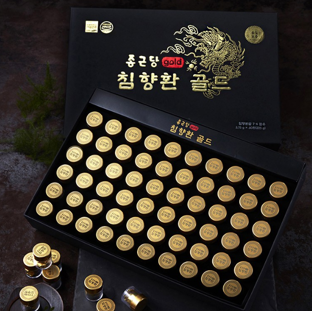 고급스러운 패키지에 어른들도 이미 잘 알고 계시는 브랜드인 종근당의 침향환 골드입니다. 기력보충이 필요할 때라던지, 피곤함을 자주 느끼는 분들이 복용하기 쉽게 구성되어 있지만 고급스러움은 살린 패키지로 인기가 많죠. 이미 많은 분들이 선물세트 중 하나로 생각하고 있지 않을까 싶습니다.