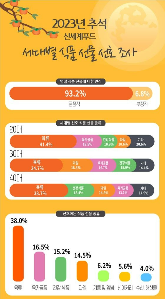 다가오는 민족 대명절 추석. 가까운 지인들에게 줄 선물을 많이 준비하실텐데요. 어떤 선물이 가장 인기가 많은지 2023년 기준 선호도를 조사해보았다고 합니다. 가장 먼저 1위는 세대를 가르지 않고 20~40대 모두 육류에 대한 반응이 가장 긍정적으로 높았습니다. 역시 인생은 고기서 고기라는 말이 딱 맞는 결과가 아닐까 싶습니다. 특히 이번 추석부터는 농수산물이 청탁금지법을 적용받는 한도가 최대 30만원까지 높아졌기 때문에 벌써부터 20만원대 육류 선물세트가 설날 대비 빠르게 소진되고 있다고 합니다. 추석 선물을 준비하실 분들은 참고하셔서 구매하시길 바랍니다.