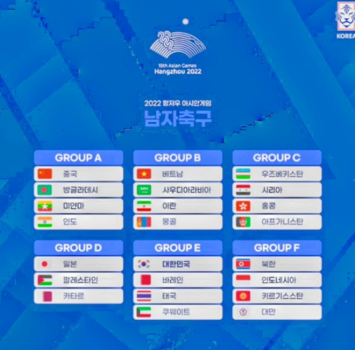 아시안게임의 경우 23개국이 6개 조로 나뉘어 조별리그를 치르며, 16강에 진출한 4개국이 토너먼트 방식으로 우승을 가립니다. 한국은 개최국인 중국을 비롯해 일본, 북한, 우즈베키스탄, 베트남과 함께 1포트로 분류되었습니다.
