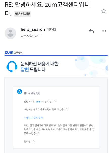 이렇게 요청하고 나면 ZUM의 안내대로 5일 이내에 메일로 결과가 통보되는데요.