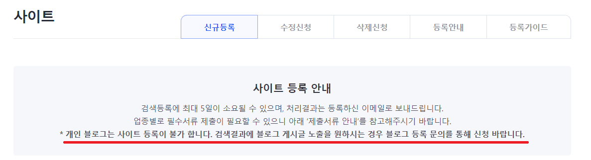 그래서 티스토리를 처음 시작하신 분들이 '개인블로그'가 아닌 '사이트' 등록으로 신청했을 경우에는