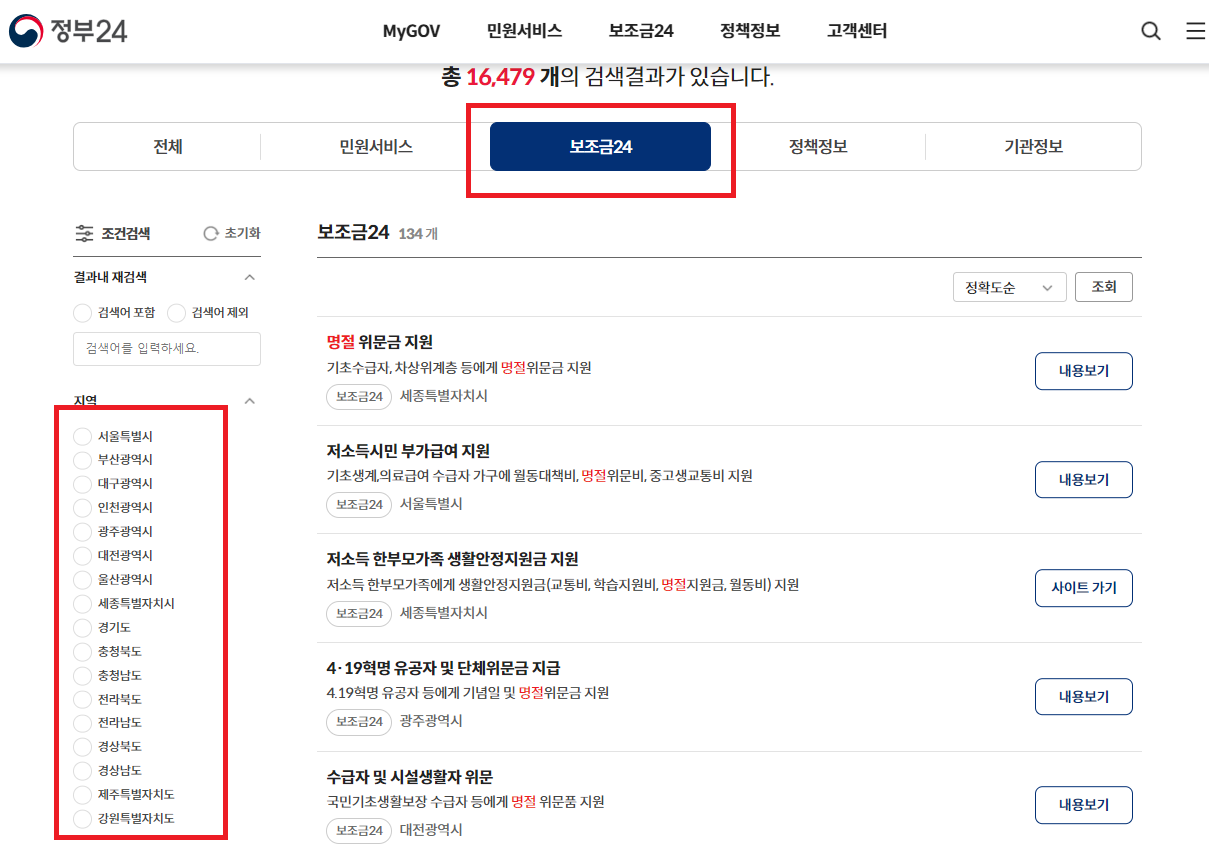 추석 검색 후, 결과 탭 중 '보조금24' 탭을 클릭해줍니다. 그리고 난 뒤 왼쪽에 지역 탭을 클릭해 본인이 거주하고 있는 지역을 클릭해주세요.