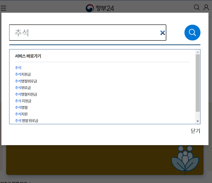 그 다음 검색탭에서 추석을 검색해주세요. 벌써 추석지원금, 추석명절위로금 등 다양한 서비스가 보입니다.