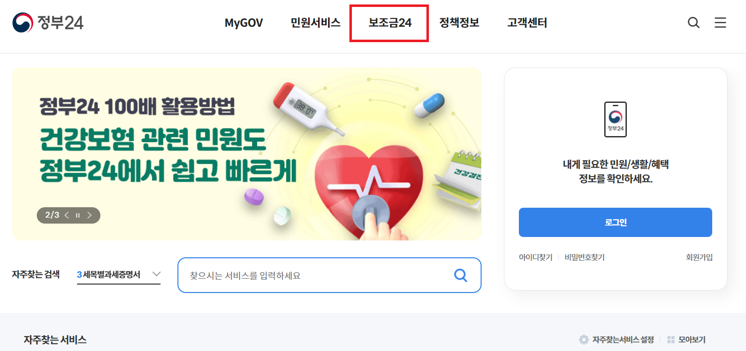 정부24 홈페이지 > 보조금24 탭을 클릭해줍니다.