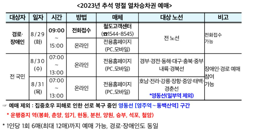예매 대상은 추석 명절 전날인 9월 27일부터 10월 3일까지 일주일동안 운행하는 KTX,ITX,새마을,무궁화호 열차입니다.