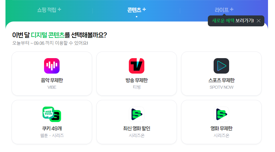 네이버 플러스 멤버십에서 콘텐츠+를 클릭하면 6가지의 디지털 콘텐츠를 무료로 이용할 수 있는데요. 이곳에서 티빙을 클릭해줍니다. 그러면 아래 창과 같이 티빙에서 제공하는 각종 방송을 무제한으로, 무료로 이용할 수 있는 창이 뜹니다.