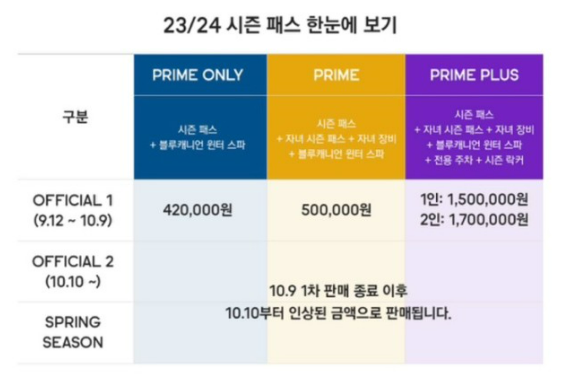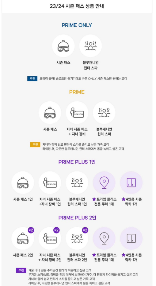 - 혜택: 시즌패스 + 자녀시즌 패스 + 자녀장비 + 블루캐니언스파 + 전용주차 1대 + 4인용 시즌 락커