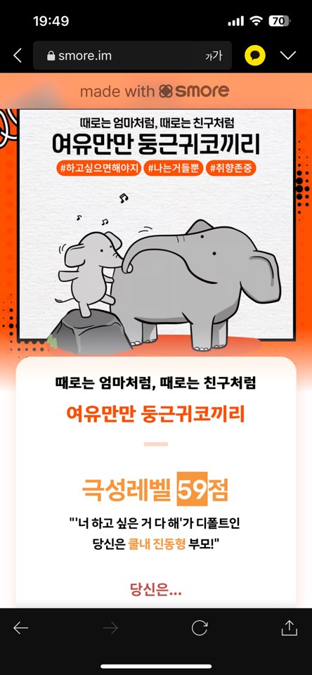 생각보다 간단한 테스트여서 금방 결과를 알아볼 수 있었습니다. 저는 아직 아이는 없지만 제 유형은 여유만만 둥근 코끼리가 나왔습니다. 극성부모는 안 되어서 다행이라는 생각이 들었네요.